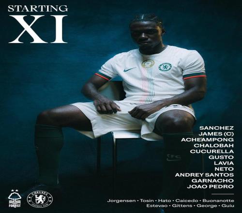 切尔西首发:1-桑切斯、24-詹姆斯、34-阿昌庞、23-查洛巴、3-库库雷利亚、27-古斯托、45-拉维亚、7-内托、17-桑托斯、49-加纳乔、20-佩德罗